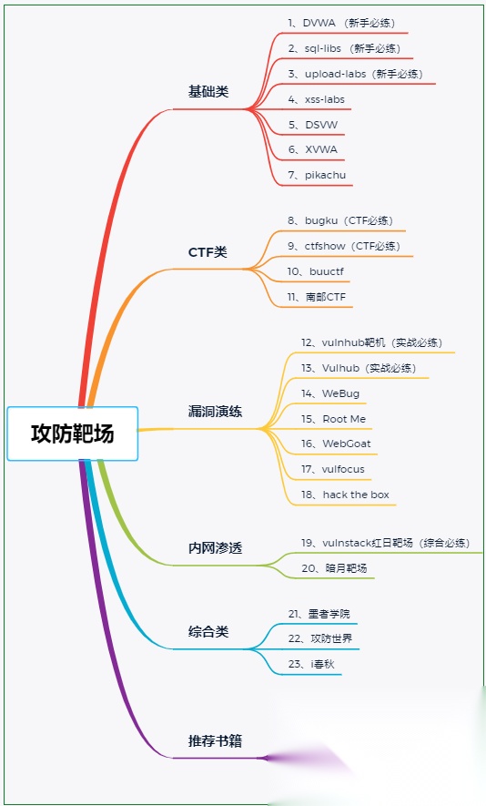 从事网络安全界10余年,总结了5大类23个网络靶场,以及推荐4本必看书籍。