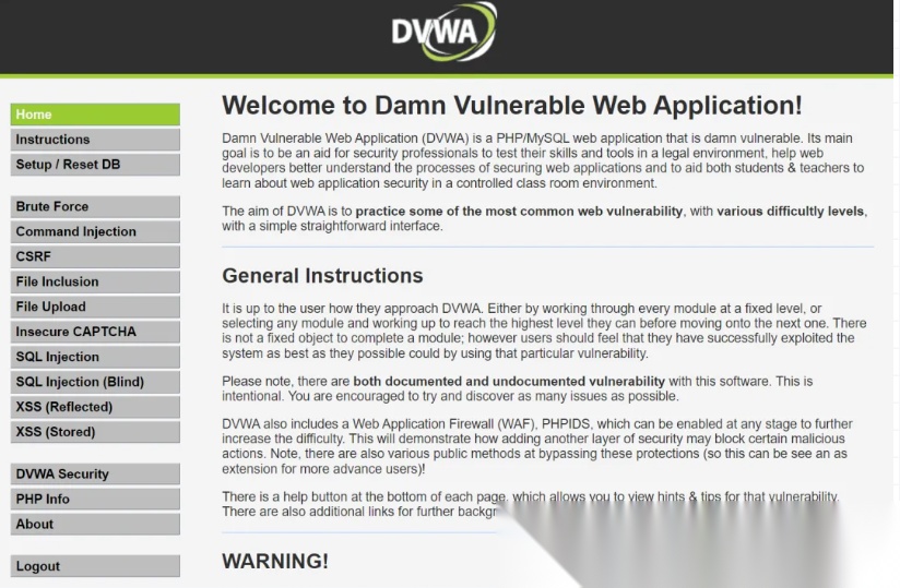 DVWA包含了 OWASP TOP10 的所有攻击漏洞的练习环境,一站式解决所有 Web 渗透的学习环境。