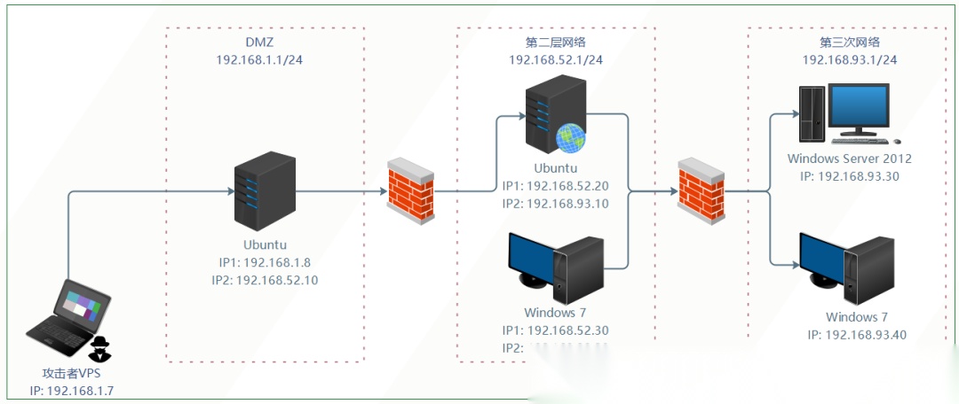 网上可以百度道教程,官网下载镜像,本地VM搭建靶场。包括3层、4层内网。