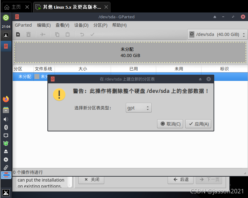 点击设备→创建分区表→选择新分区表类型,我选择的gpt→应用