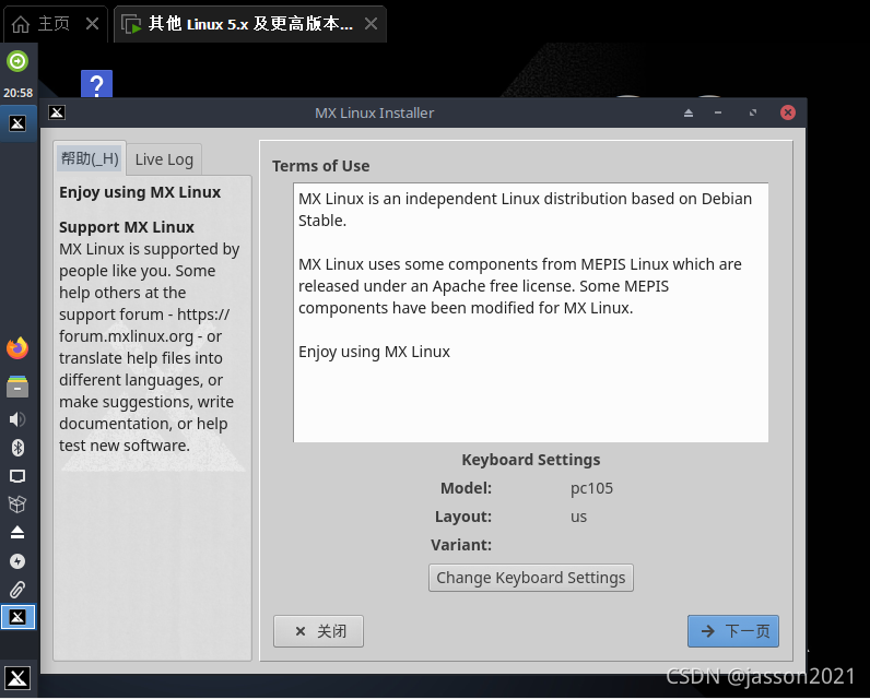 6、进入成功后你可以暂时体验一下,因为基于Debian对inter网卡支持不好,我只能虚拟机装。双击安装图标,进入键盘设置界面,下面Change Keyboard Settings是改变键盘设置,根据自己需要更换,不知道就默认,然后下一步。