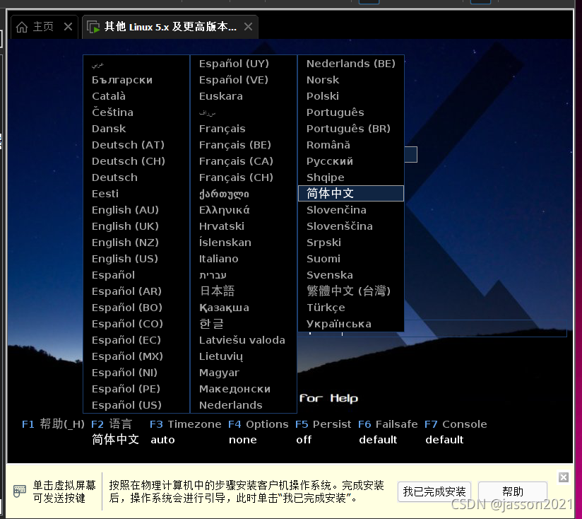 4、开启虚拟机→引导界面按F2选择中文→回车确定