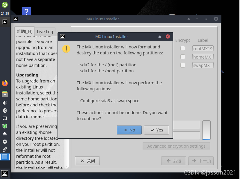 设置好后点击下一步,提示MX Linux安装需要格式化磁盘,并销毁数据,然后就是显示分区用于什么目的,下面是说将之前分的swap分区用于虚拟内存空间,最后告诉你操作不可取消,问你是否继续,如果你不想改变什么就点击yes。