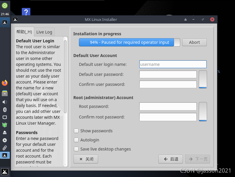 设置用户名、密码和root账户密码,最下面三个选项依次是显示密码、自动登录、保存live系统设置到新安装系统,设置好后点击下一步。