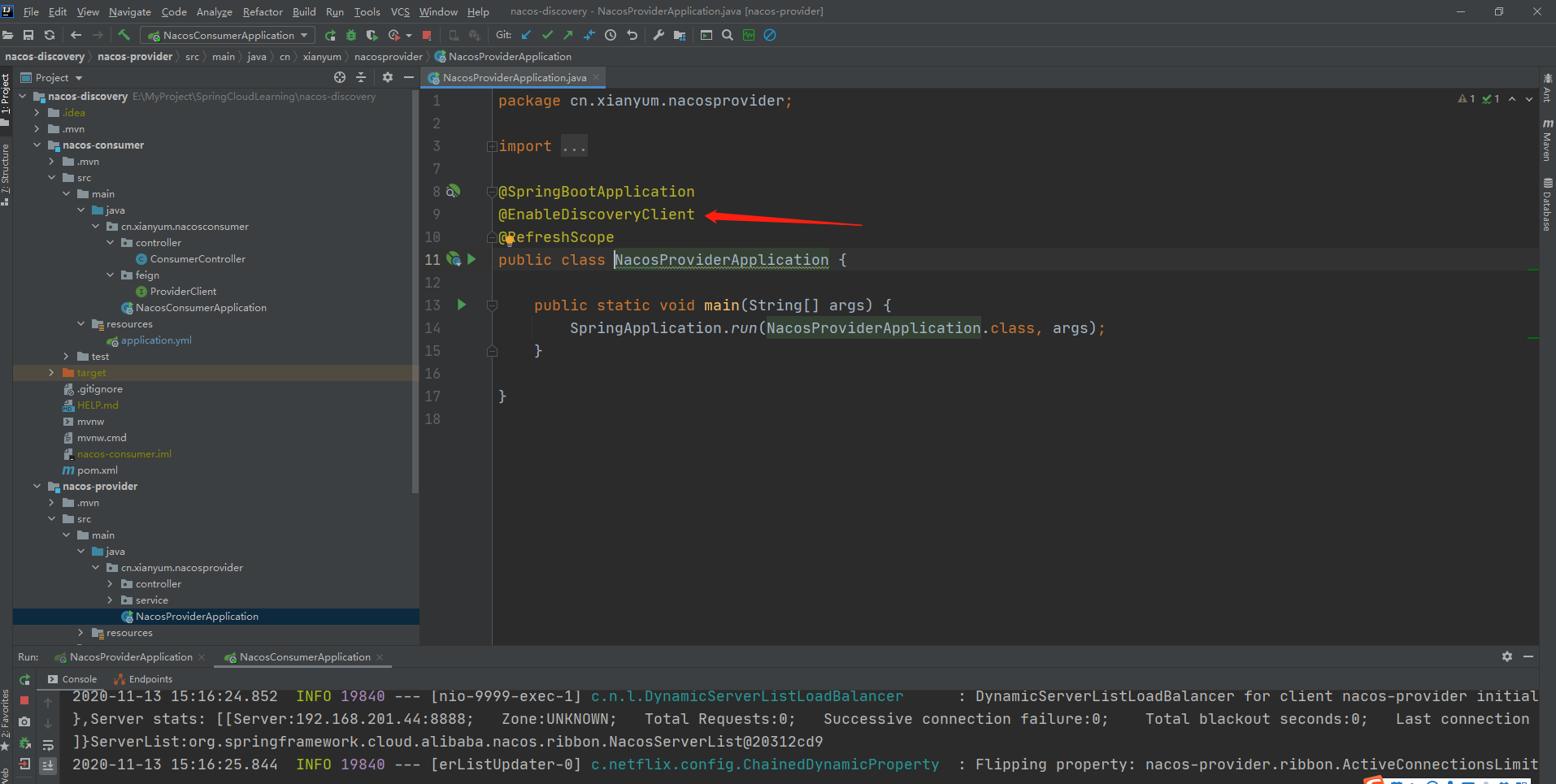 使用两个服务注册到Nacos上,分别为nacos-provider和nacos-consumer。