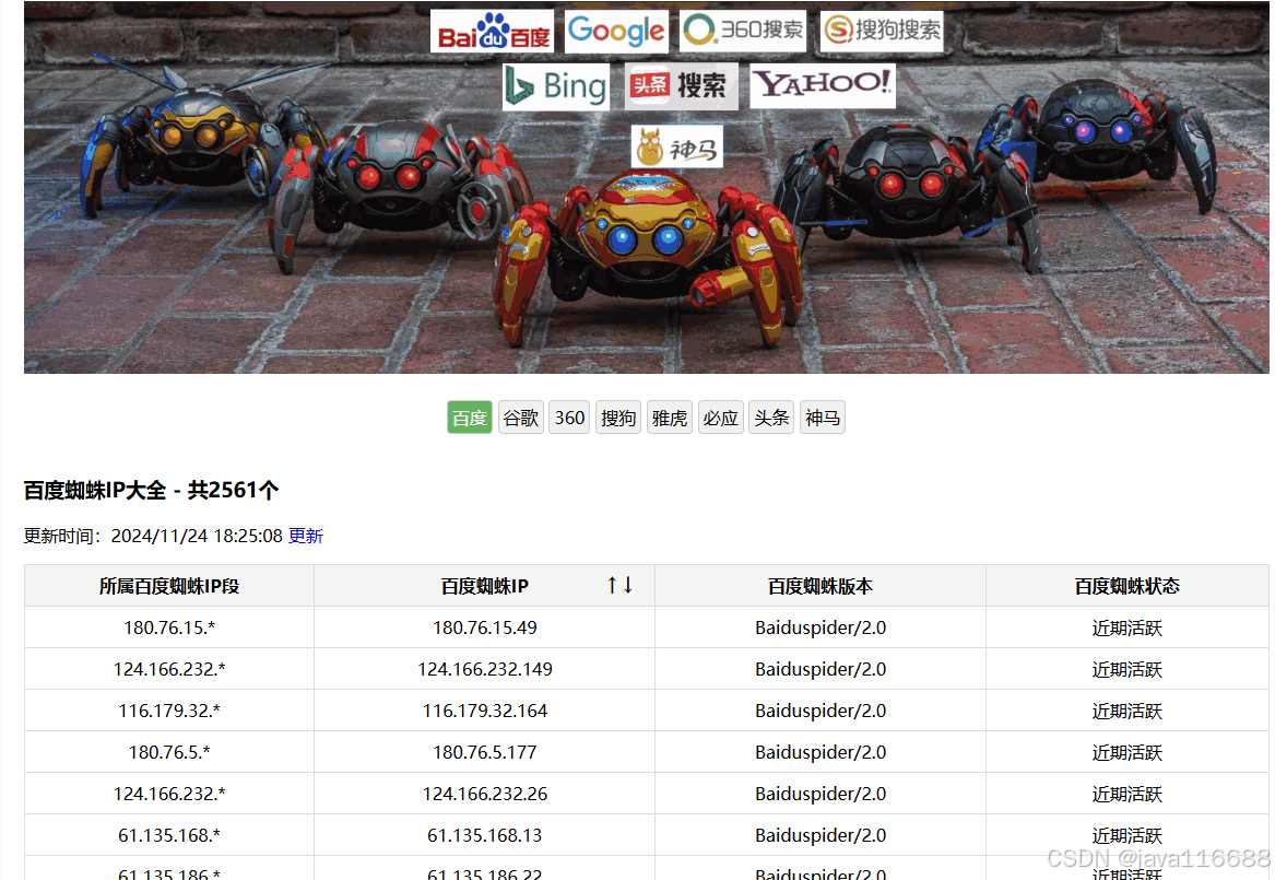 百度蜘蛛(Baiduspider)是百度搜索引擎的核心组件。以下是最新的百度蜘蛛IP段及活跃状态(数据更新时间:2024/11/24 18:25:08): 数据来源 www.xbgjw.com/spider_baidu 百度蜘蛛IP大全 - ip查询 - ip段汇总