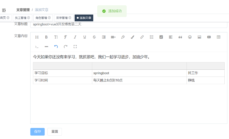 该文章展示了如何使用Vue3和ElementPlus构建前端界面,包括登录注册、文章发布以及文章管理功能。后端采用SpringBoot和MybatisPlus,结合MySQL数据库,实现数据存储。文章详细介绍了前端添加文章的实现,包括富文本编辑器的使用,以及后端新增、查询文章的接口设计和数据库表结构。