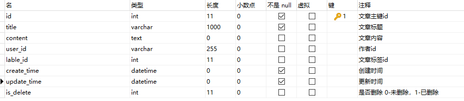 `id` int(11) NOT NULL AUTO_INCREMENT COMMENT '文章主键id',