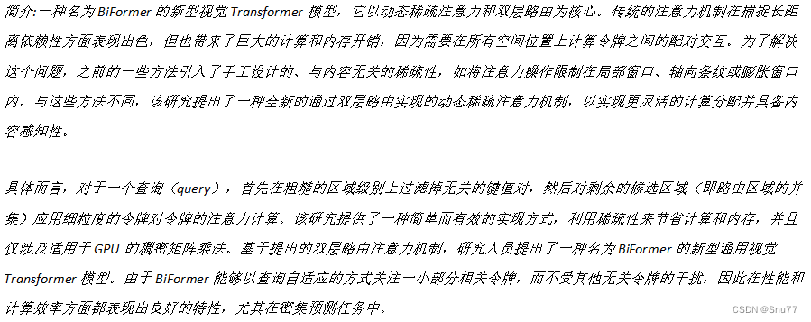 BiFormer是一种结合了Bi-level Routing Attention的视觉Transformer模型,BiFormer模型的核心思想是引入了双层路由注意力机制。在BiFormer中,每个图像块都与一个位置路由器相关联。这些位置路由器根据特定的规则将图像块分配给上层和下层路由器。上层路由器负责捕捉全局上下文信息,而下层路由器则负责捕捉局部区域的细节。