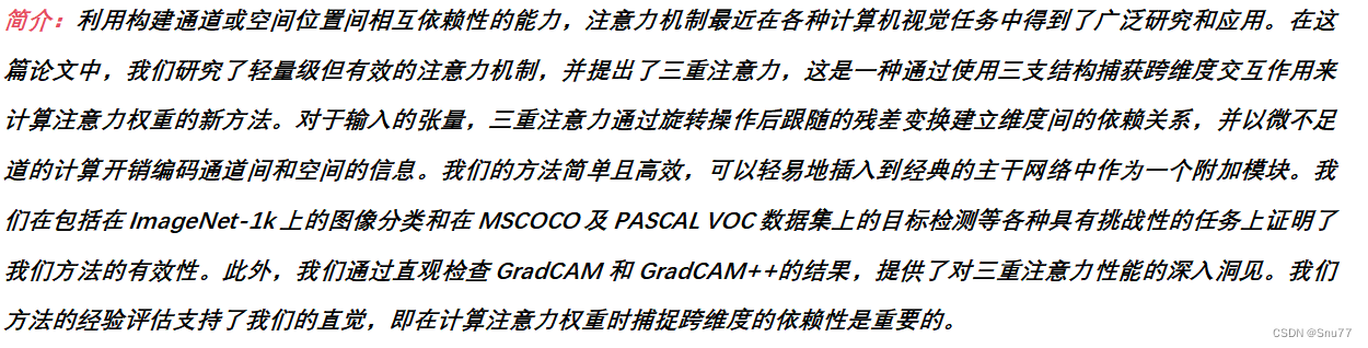 本文给大家带来的改进是Triplet Attention三重注意力机制。这个机制,它通过三个不同的视角来分析输入的数据,就好比三个人从不同的角度来观察同一幅画,然后共同决定哪些部分最值得注意。三重注意力机制的主要思想是在网络中引入了一种新的注意力模块,这个模块包含三个分支,分别关注图像的不同维度。比如说,一个分支可能专注于图像的宽度,另一个分支专注于高度,第三个分支则聚焦于图像的深度,即色彩和纹理等特征。这样一来,网络就能够更全面地理解图像内容,就像是得到了一副三维眼镜,能够看到图片的立体效果一样。