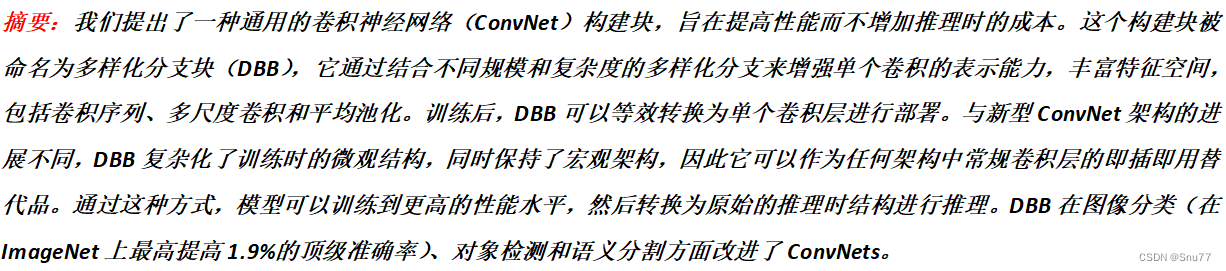 本文带来的改进机制是YOLOv8模型与多元分支模块(Diverse Branch Block)的结合,Diverse Branch Block (DBB) 是一种用于增强卷积神经网络性能的结构重新参数化技术。这种技术的核心在于结合多样化的分支,这些分支具有不同的尺度和复杂度,从而丰富特征空间。我将其放在了YOLOv8的不同位置上均有一定的涨点幅度,同时这个DBB模块的参数量并不会上涨太多,我添加三个该机制到模型中,GFLOPs上涨了0.4。