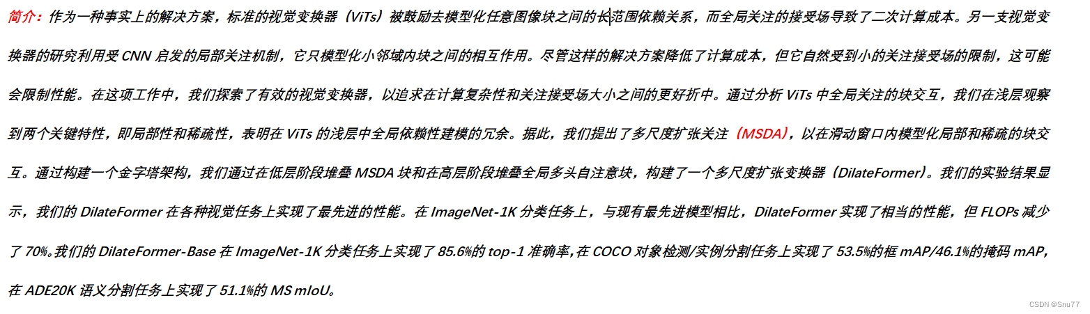 本文给大家带来的改进机制是MSDA(多尺度空洞注意力)发表于今年的中科院一区(算是国内计算机领域的最高期刊了),其全称是"DilateFormer: Multi-Scale Dilated Transformer for Visual Recognition"。MSDA的主要思想是通过线性投影得到特征图X的相应查询、键和值。然后,将特征图的通道分成n个不同的头部,并在不同的头部中以不同的扩张率执行多尺度SWDA来提高模型的处理效率和检测精度。亲测在小目标检测和大尺度目标检测的数据集上都有大幅度的涨点效果(mAP直接涨了大概有0.06左右)。最后本文会手把手教你添加MSDA模块到网络结构中。