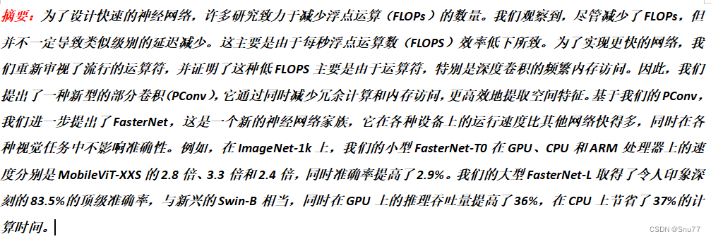 本文给大家带来的改进机制是FasterNet网络,将其用来替换我们的特征提取网络,其旨在提高计算速度而不牺牲准确性,特别是在视觉任务中。它通过一种称为部分卷积(PConv)的新技术来减少冗余计算和内存访问。这种方法使得FasterNet在多种设备上运行速度比其他网络快得多,同时在各种视觉任务中保持高准确率。经过我的实验该主干网络确实能够涨点在大中小三种物体检测上,大家可以在源代码中进行修改版本的使用。本文通过介绍其主要框架原理,然后教大家如何添加该网络结构到网络模型中。