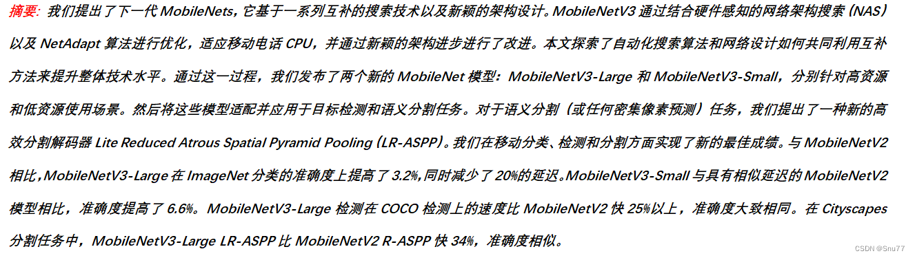 本文给大家带来的改进机制是MobileNetV3,其主要改进思想集中在结合硬件感知的网络架构搜索(NAS)和NetAdapt算法,以优化移动设备CPU上的性能。它采用了新颖的架构设计,包括反转残差结构和线性瓶颈层,以及新的高效分割解码器Lite Reduced Atrous Spatial Pyramid Pooling(LR-ASPP),以提升在移动分类、检测和分割任务上的表现。实验表明,MobileNets在资源和准确性的权衡方面表现出色,并在多种应用(如对象检测、细粒度分类、面部属性识别和大规模地理定位)中展现了其有效性。