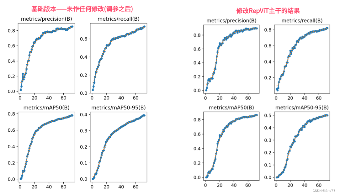 本位给大家带来的改进机制是RepViT。它是一种最新发布的网络结构,把轻量级的视觉变换器(就是ViT)的设计理念融入到了我们常用的轻量级卷积神经网络(CNN)里。我尝试把它用在RT-DETR的主干网络上,效果还不错,mAP有一定的提高。我用的是这个网络中最轻量级的版本。 我将其用于在我的数据上实验(包含多个类别其中包含大中小多个目标类别),无论哪种目标,精度均有所提升。接下来,我会展示一下原始版本和我改进后版本在训练上的对比图。之后会在文章中介绍该网络结构,然后教大家如何修改该网络结构,同时修改该主干参数量下降四分之一相对于ResNet18。