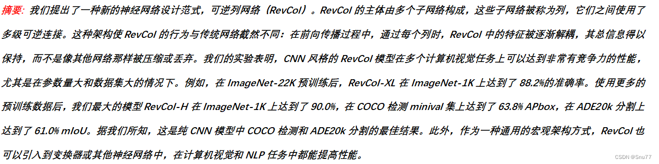 本文给大家带来的是主干网络RevColV1,翻译过来就是可逆列网络去发表于ICLR2022,其是一种新型的神经网络设计(和以前的网络结构的传播方式不太一样),由多个子网络(列)通过多级可逆连接组成。这种设计允许在前向传播过程中特征解耦,保持总信息无压缩或丢弃。其非常适合数据集庞大的目标检测任务,数据集数量越多其效果性能越好,亲测在包含1000个图片的数据集上其涨点效果就非常明显了,大家可以多动手尝试,其RevColV2的论文同时已经发布如果代码开源我也会第一时间给大家上传。