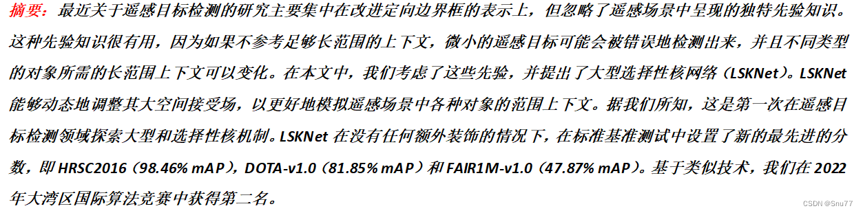 本文给大家带来的改进内容是LSKNet(Large Kernel Selection, LK Selection),其是一种专为遥感目标检测设计的网络架构,其核心思想是动态调整其大的空间感受野,以更好地捕捉遥感场景中不同对象的范围上下文。实验部分我在一个包含三十多个类别的数据集上进行实验,其中包含大目标检测和小目标检测,mAP的平均涨点幅度在0.04-0.1之间(也有极个别的情况没有涨点),同时官方的版本只提供了一个大版本,我在其基础上提供一个轻量化版本给大家选择,本文会先给大家对比试验的结果,供大家参考。