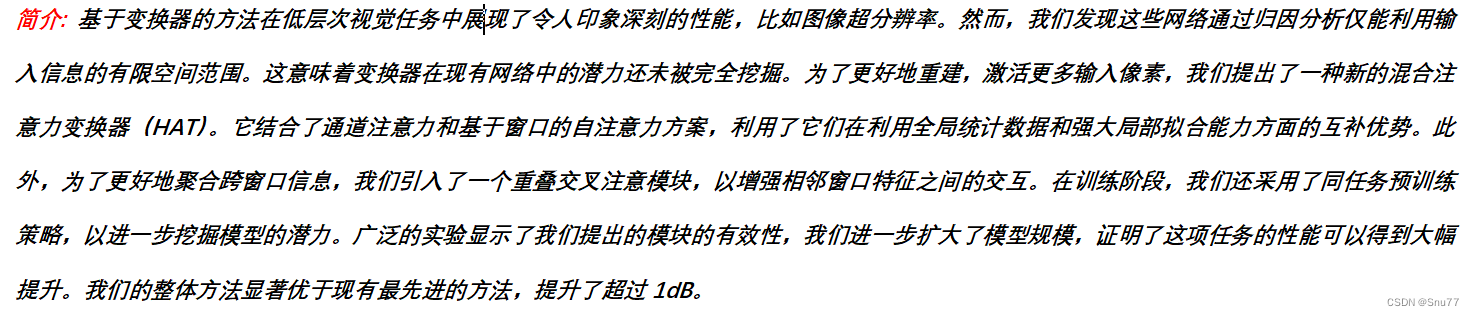 本文给大家带来的改进机制是HAttention注意力机制,混合注意力变换器(HAT)的设计理念是通过融合通道注意力和自注意力机制来提升单图像超分辨率重建的性能。通道注意力关注于识别哪些通道更重要,而自注意力则关注于图像内部各个位置之间的关系。HAT利用这两种注意力机制,有效地整合了全局的像素信息,从而提供更为精确的结果(这个注意力机制挺复杂的光代码就700+行),但是效果挺好的也是10月份最新的成果非常适合添加到大家自己的论文中。同时在开始讲解之前推荐一下我的专栏,本专栏的内容支持(分类、检测、分割、追踪、关键点检测),专栏目前为限时折扣,欢迎大家订阅本专栏,本专栏每周更新3-5篇最新机制,更有包含我所有改进的文件和交流群提供给大家。