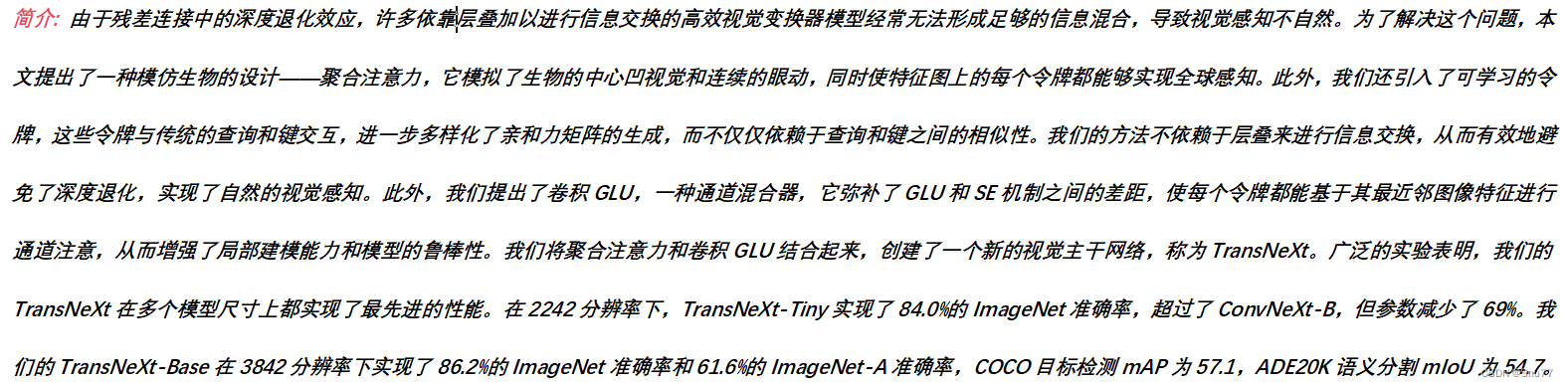 本文给大家带来的改进机制是TransNeXt特征提取网络,其发表于2023年的12月份是一个最新最前沿的网络模型,将其应用在我们的特征提取网络来提取特征,同时本文给大家解决其自带的一个报错,通过结合聚合的像素聚焦注意力和卷积GLU,模拟生物视觉系统,特别是对于中心凹的视觉感知。这种方法使得每个像素都能实现全局感知,并强化了模型的信息混合和自然视觉感知能力。TransNeXt在各种视觉任务中,包括图像分类、目标检测和语义分割,都显示出优异的性能(该模型的训练时间很长这是需要大家注意的)。