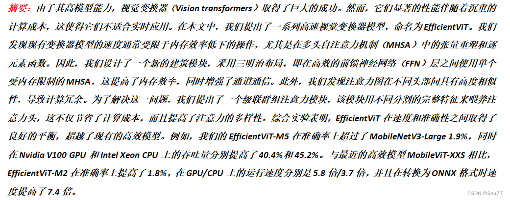 本文给大家带来的改进机制是主干网络,一个名字EfficientViT的特征提取网络(和之前发布的只是同名但不是同一个),其基本原理是提升视觉变换器在高效处理高分辨率视觉任务的能力。它采用了创新的建筑模块设计,包括三明治布局和级联群组注意力模块。其是一种高效率的特征提取网络训练速度非常快,推理速度也要比基础版本的要快,其效果完爆之前的MobileNetV3等轻量化网络模型。欢迎大家订阅本专栏,本专栏每周更新3-5篇最新机制,更有包含我所有改进的文件和交流群提供给大家。