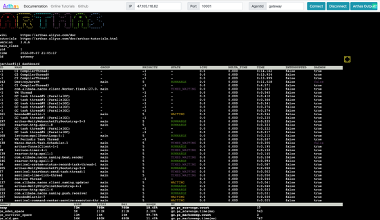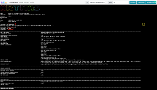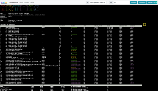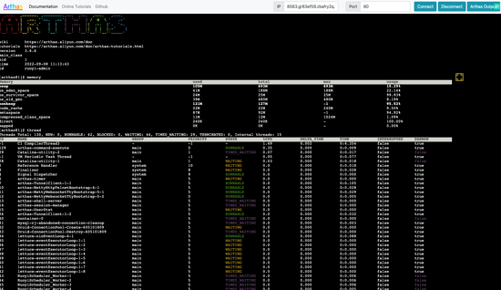 同时 Arthas 也支持通过 Web Console 进入命令行交互模式,这适用于开发人员没有服务器权限时通过 Arthas Web Console 诊断业务。