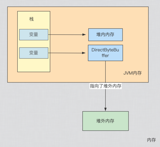 在JAVA中,JVM划分了堆内存,平时创建的对象基本都在堆中,不过也可以通过NIO包下的 ByteBuffer 申请堆外内存 DirectByteBuffer :