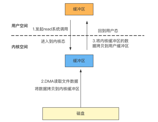 整个读取过程发生了两次数据拷贝,一次是DMA将磁盘上的文件数据拷贝到内核缓冲区,一次是将内核缓冲区的数据拷贝到用户缓冲区。