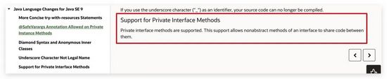 从官方的文档中我们可以找到下面的描述,在 JDK 9 中接口支持私有方法,主要用于不同的非抽象方法中共享代码。