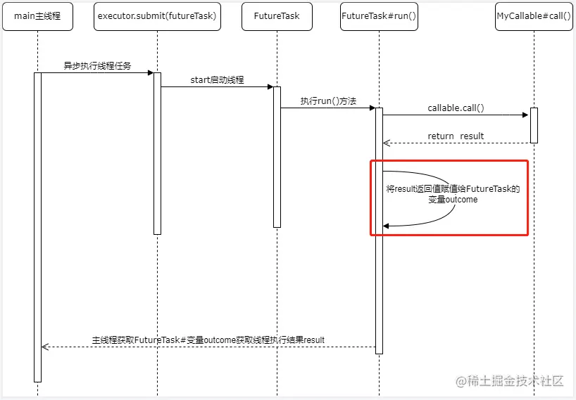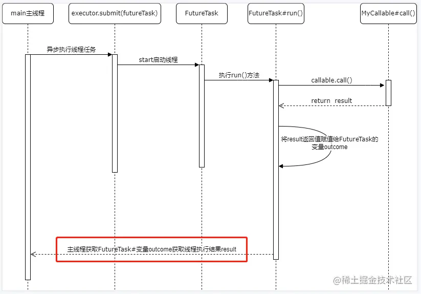 以上就是执行线程任务run方法后,如何将线程任务结果返回给主线程,其实,还少一个地方补充,就是如何将FutureTask任务丢给线程执行,我们这里用到了线程池, 但是execute(ftask)底层同样是使用一个了线程通过执行start方法开启一个线程,这个新运行的线程最终会执行FutureTask的run方法。