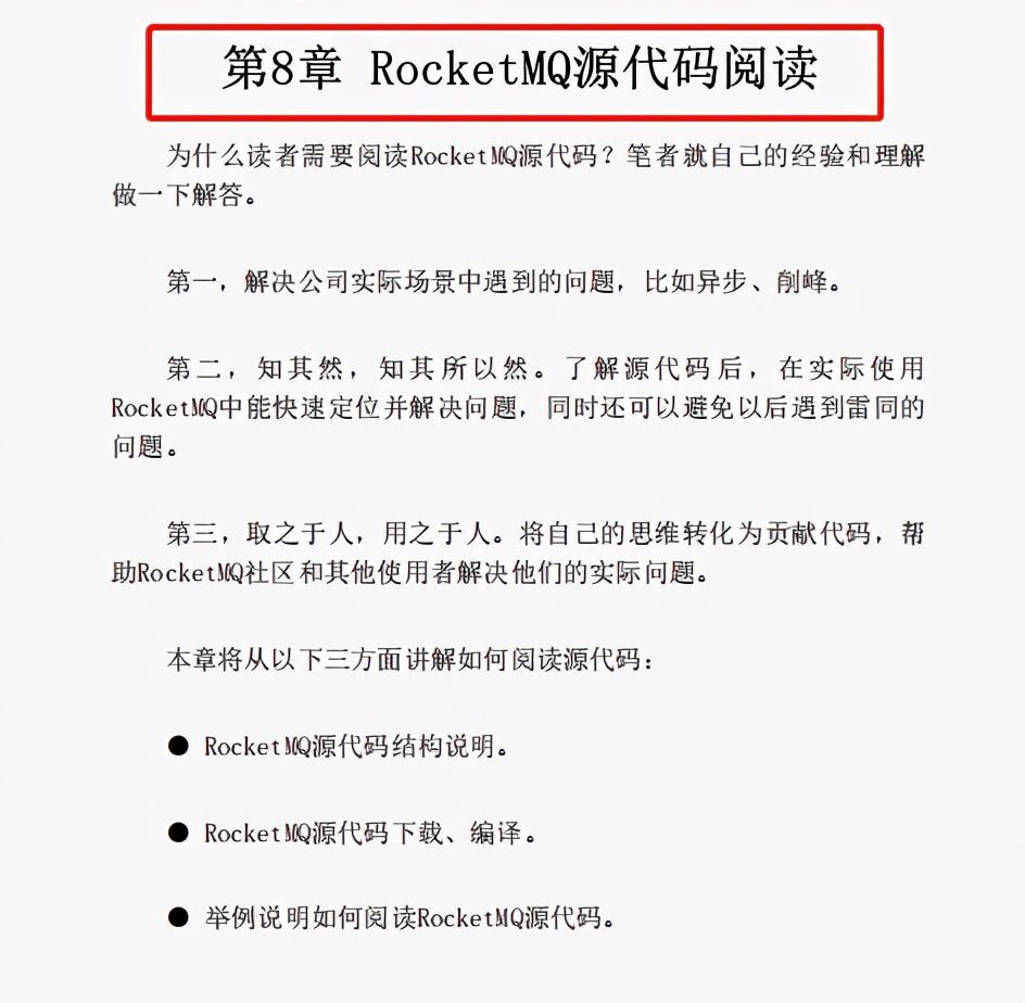今天就在这里分享一份由阿里 P8 架构师纯手工打造的 RocketMQ 分布式消息中间件核心原理与最佳实践笔记,这份笔记从 RocketMQ 的实际使用到 RocketMQ 的源码分析,再到 RocketMQ 企业落地实践方案,逐步讲解。使读者由浅入深地了解 RocketMQ!