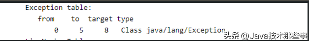 个人理解,from 和 to 相当于划分区间,只要在这个区间内抛出了type 所对应的,“java/lang/Exception” 异常(主动athrow 或者 由jvm运行时检测到异常自动抛出),那么就跳转到target 所代表的第八行。