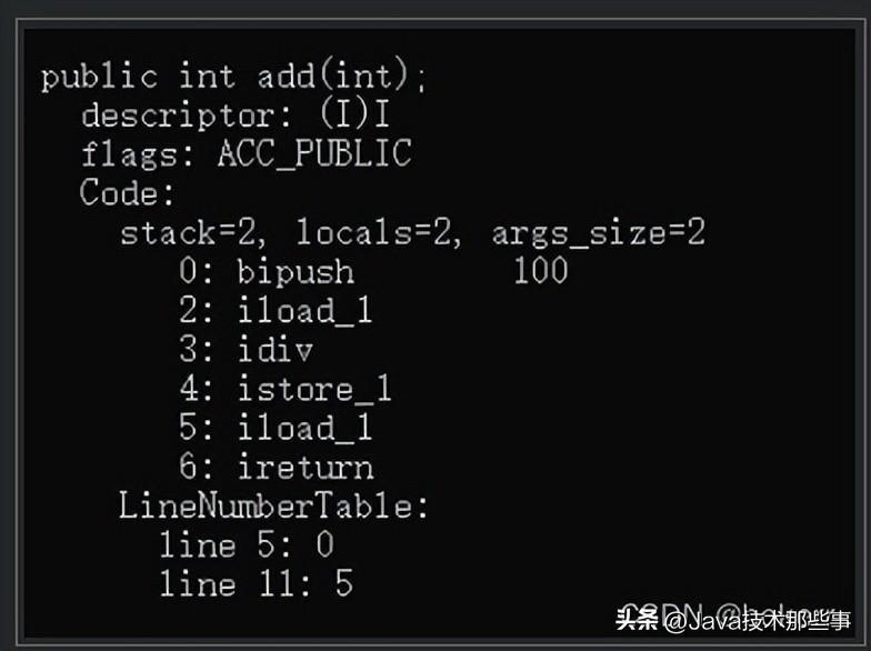 public int add(int); descriptor: (I)I flags: ACC_PUBLIC Code: stack=2, locals=3, args_size=2 0: bipush 100 // 加载参数100 2: iload_1 // 将一个int型变量推至栈顶 3: idiv // 相除 4: istore_1 // 除的结果值压入本地变量 5: goto 11 // 跳转到指令:11 8: astore_2 // 将引用类型值压入本地变量 9: bipush 100 // 将单字节常量推送栈顶<这里与数值100有关,可以尝试修改100后的编译结果:iconst、bipush、ldc> 10: istore_1 // 将int类型值压入本地变量 11: iload_1 // int 型变量推栈顶 12: ireturn // 返回 // 注意看 from 和 to 以及 targer,然后对照着去看上述指令 Exception table: from to target type 0 5 8 Class java/lang/Exception LineNumberTable: line 6: 0 line 9: 5 line 7: 8 line 8: 9 line 10: 11 StackMapTable: number_of_entries = 2 frame_type = 72 /* same_locals_1_stack_item */ stack = [ class java/lang/Exception ] frame_type = 2 /* same */