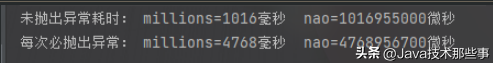 private int getThenAddNoJudge(JSONObject json, String key){ if (Objects.isNull(json)) throw new IllegalArgumentException("参数异常"); int num; try { // 不校验 key 是否未空值,直接调用 toString 每次触发空指针异常并被捕获 num = 100 + Integer.parseInt(URLDecoder.decode(json.get(key).toString(), "UTF-8")); } catch (Exception e){ num = 100; } return num; } private int getThenAddWithJudge(JSONObject json, String key){ if (Objects.isNull(json)) throw new IllegalArgumentException("参数异常"); int num; try { // 校验 key 是否未空值 num = 100 + Integer.parseInt(URLDecoder.decode(Objects.toString(json.get(key), "0"), "UTF-8")); } catch (Exception e){ num = 100; } return num; } public static void main(String[] args){ int times = 1000000;// 百万次 long nao1 = System.nanoTime(); ExecuteTryCatch executeTryCatch = new ExecuteTryCatch(); for (int i = 0; i < times; i++){ executeTryCatch.getThenAddWithJudge(new JSONObject(), "anyKey"); } long end1 = System.nanoTime(); System.out.println("未抛出异常耗时:millions=" + (end1 - nao1) / 1000000 + "毫秒 nao=" + (end1 - nao1) + "微秒"); long nao2 = System.nanoTime(); for (int i = 0; i < times; i++){ executeTryCatch.getThenAddNoJudge(new JSONObject(), "anyKey"); } long end2 = System.nanoTime(); System.out.println("每次必抛出异常:millions=" + (end2 - nao2) / 1000000 + "毫秒 nao=" + (end2 - nao2) + "微秒"); }