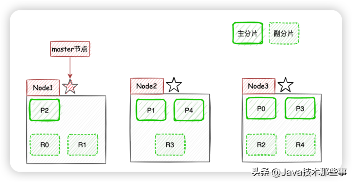 现在我们以3个节点为例,展示一下分片数量为5,副本数量为1的情况下,ES在不同节点上的分片排布情况:
