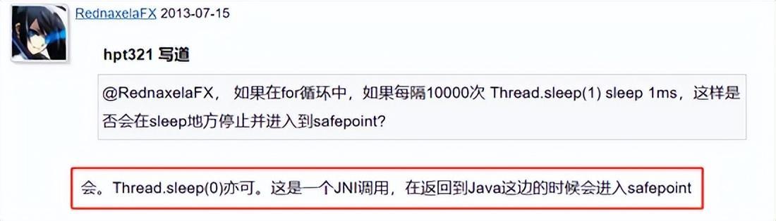 Thread.sleep(0) 这个代码看起来莫名其妙,但是我是不是可以大胆的猜测一下:故意写这个代码的人,是不是为了在这里放置一个 Safepoint 呢,以达到避免 GC 线程长时间等待,从而加长 stop the world 的时间的目的?