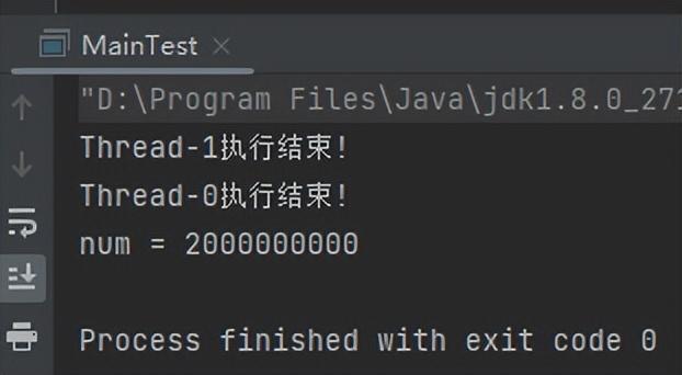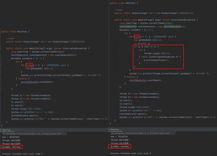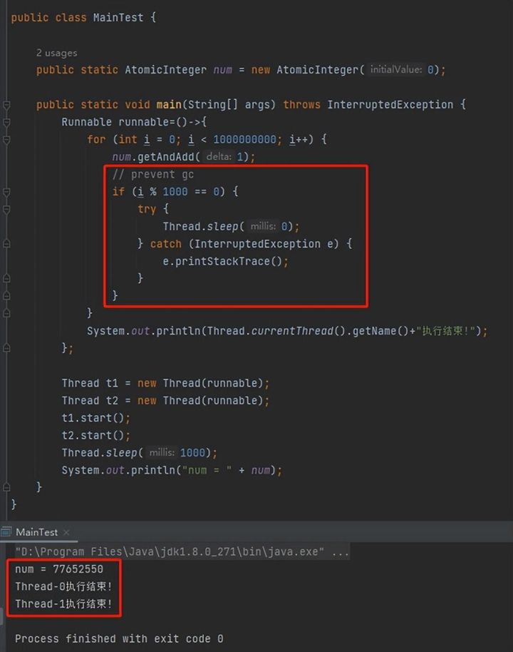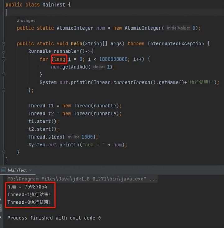 public class MainTest { public static AtomicInteger num = new AtomicInteger(0); public static void main(String[] args) throws InterruptedException { Runnable runnable=()->{ for (int i = 0; i < 1000000000; i++) { num.getAndAdd(1); } System.out.println(Thread.currentThread().getName()+"执行结束!"); }; Thread t1 = new Thread(runnable); Thread t2 = new Thread(runnable); t1.start(); t2.start(); Thread.sleep(1000); System.out.println("num = " + num); } }