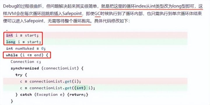 截图中的 while(i < end) 就是一个可数循环,由于执行这个循环的线程需要在循环结束后才进入 Safepoint,所以先进入 Safepoint 的线程需要等待它。从而影响到 GC 线程的运行。