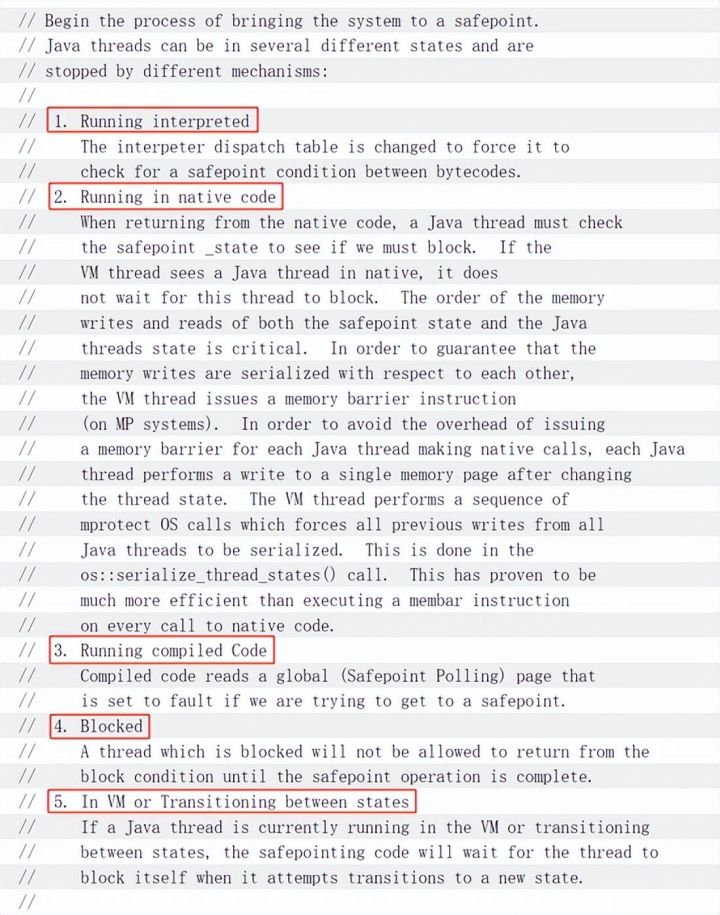 注释里面说,在程序进入 Safepoint 的时候, Java 线程可能正处于框起来的五种不同的状态,针对不同的状态有不同的处理方案。