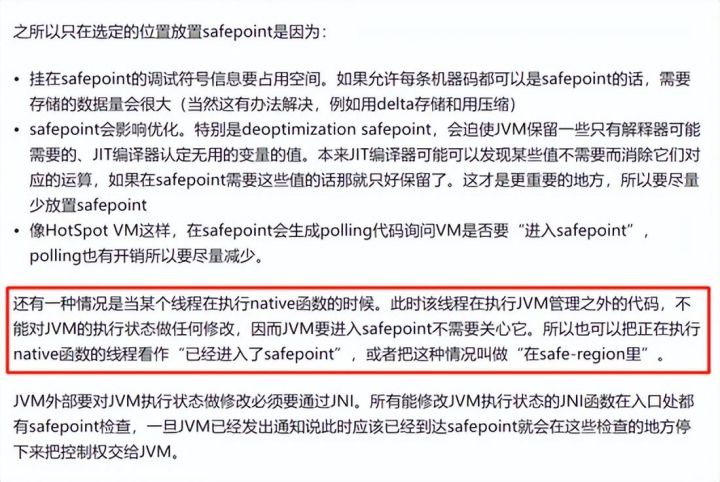 第一句话,就是答案,意思就是一个线程在运行 native 方法后,返回到 Java 线程后,必须进行一次 safepoint 的检测。