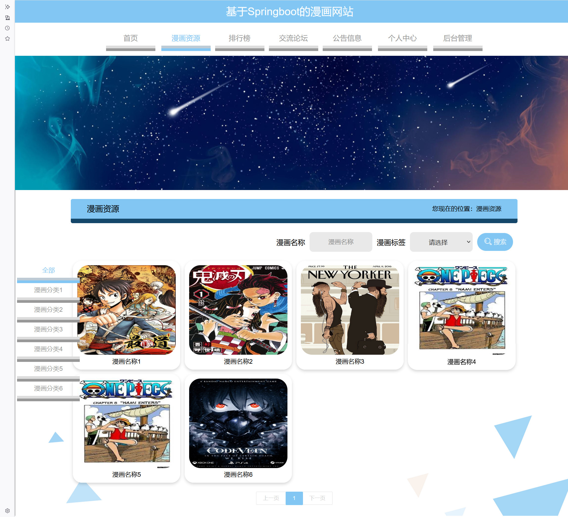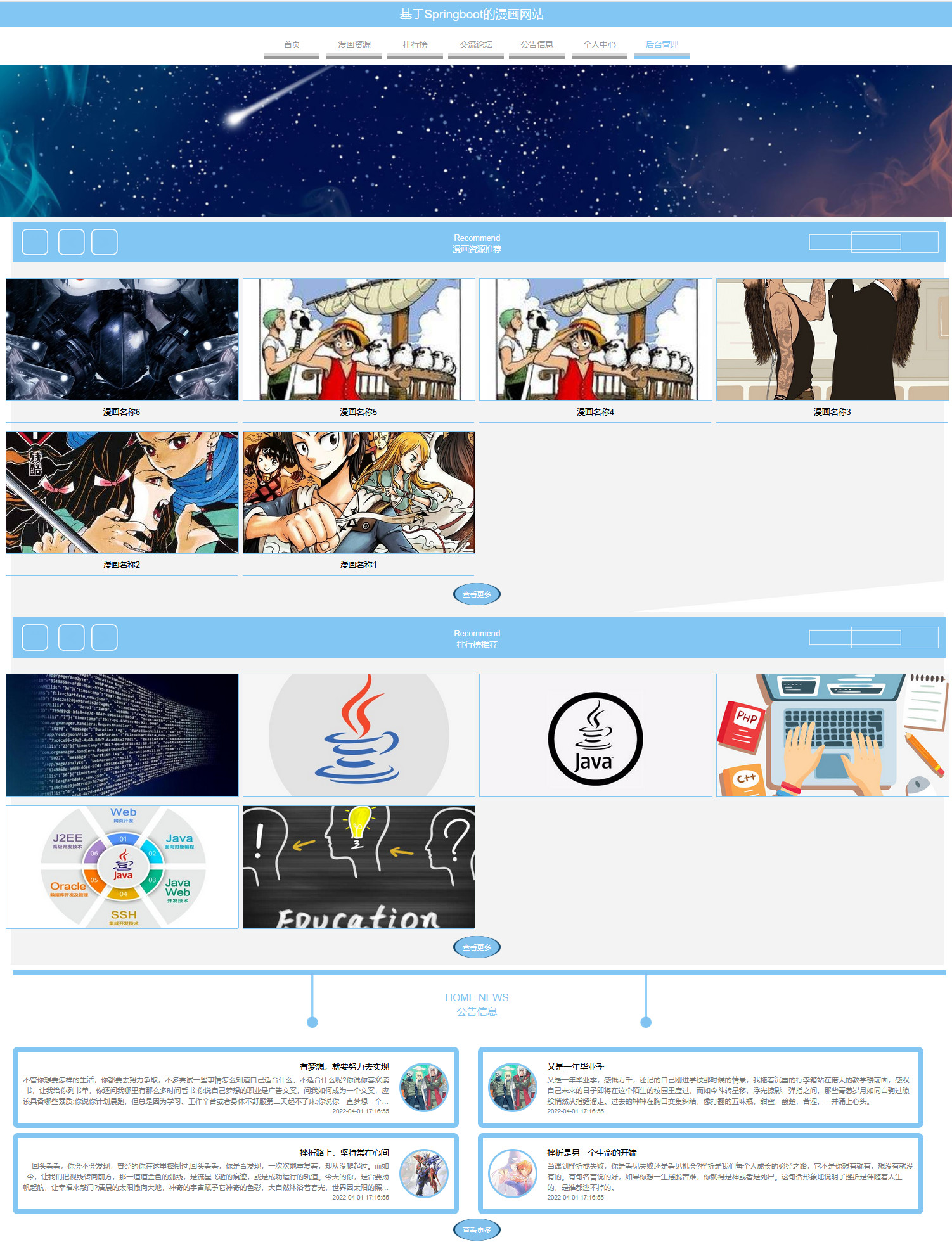 漫画网站,在系统首页可以查看首页、漫画投稿、排行榜、交流论坛、公告信息、个人中心、后台管理等内容,并进行详细操作,如图5-1所示。