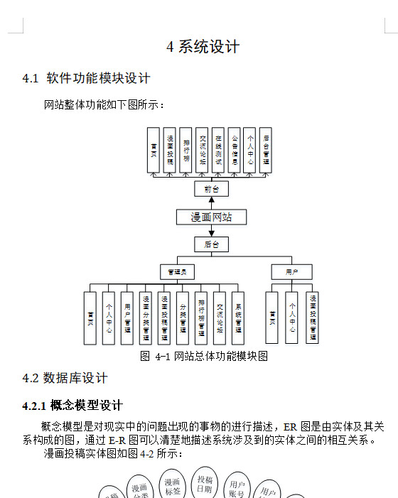 首先,论文一开始便是清楚的论述了系统的研究内容。其次,剖析系统需求分析,弄明白“做什么”,分析包括业务分析和业务流程的分析以及用例分析,更进一步明确系统的需求。然后在明白了系统的需求基础上需要进一步地设计系统,主要包括软件架构模式、整体功能模块、数据库设计。本项目软件架构选择B/S模式和java技术,总体功能模块运用自顶向下的分层思想。再然后就是实现系统并进行代码编写实现功能。论文的最后章节总结一下自己完成本论文和开发本项目的心得和总结。通过漫画网站将会使漫画信息管理各个方面的工作效率带来实质性的提升。