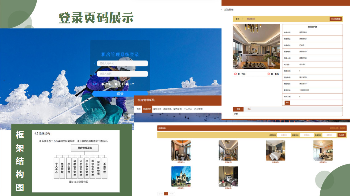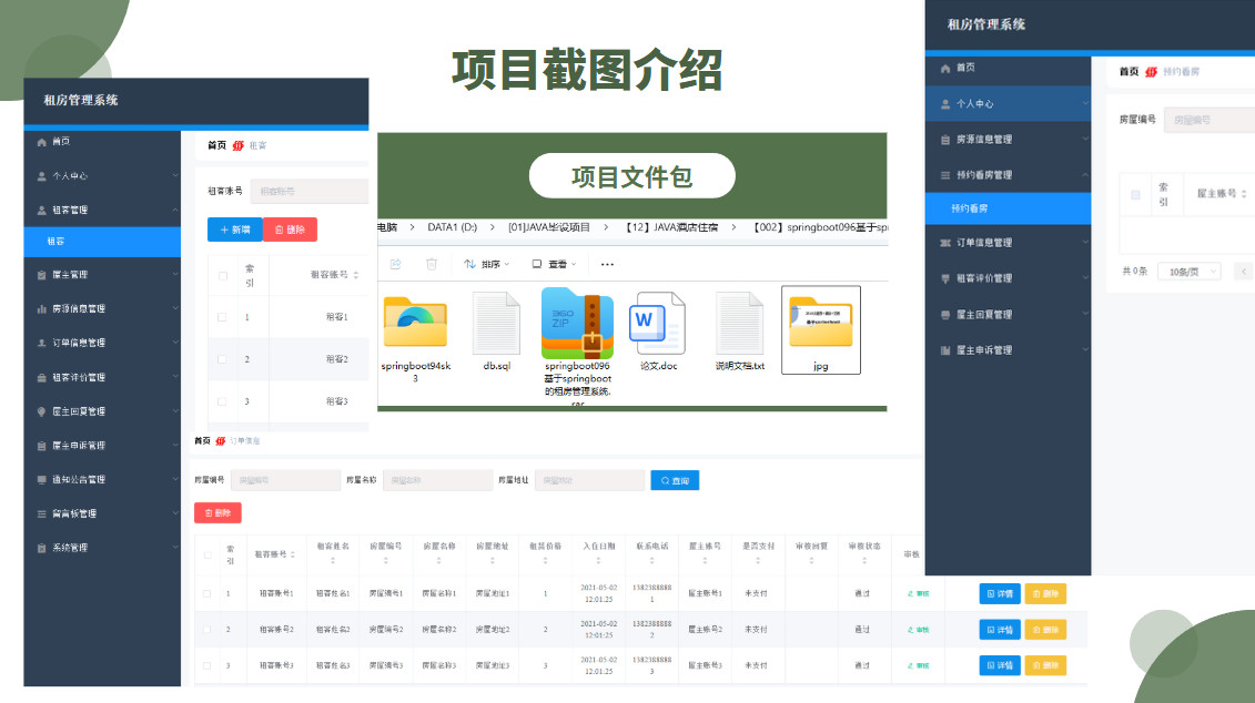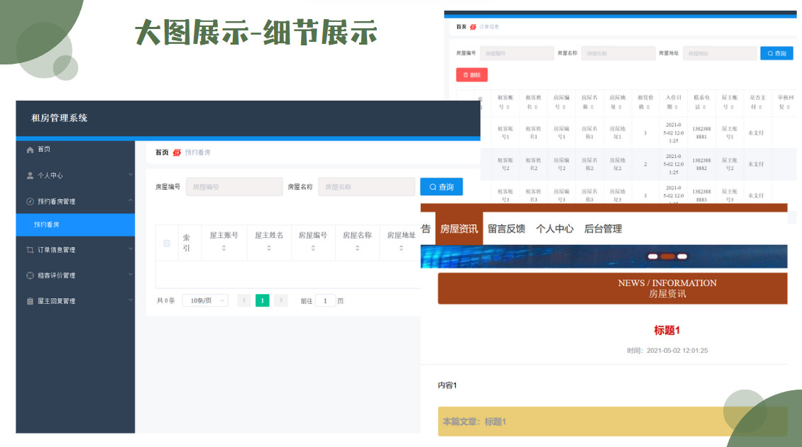 本租房管理系统有管理员,租客,屋主三个角色。管理员功能有个人中心,租客管理,屋主管理,房源信息管理,订单信息管理,屋主申诉管理,通知公告管理,留言板管理,系统管理等。屋主发布房源信息,租客预约看房,生成订单。因而具有一定的实用性。