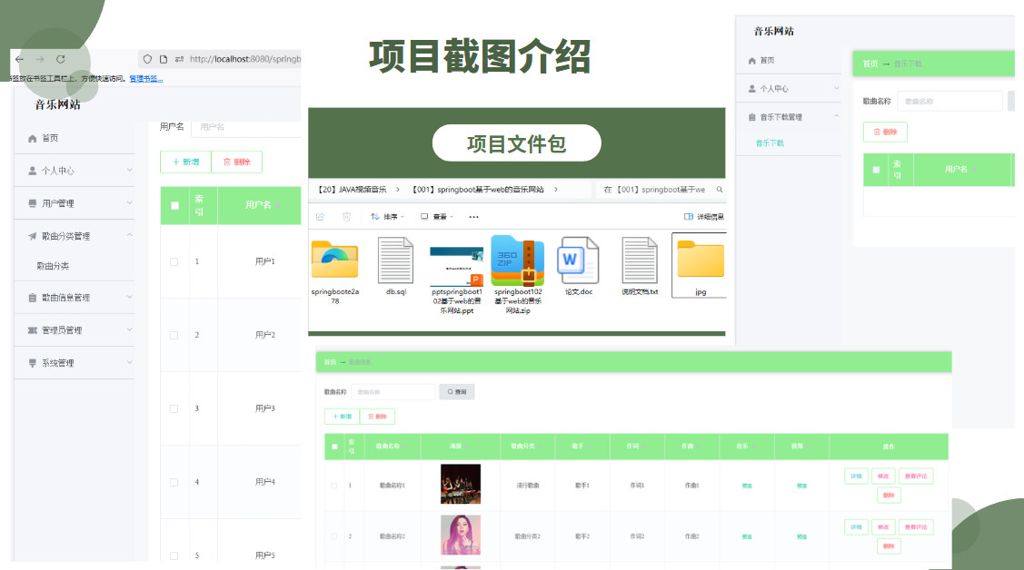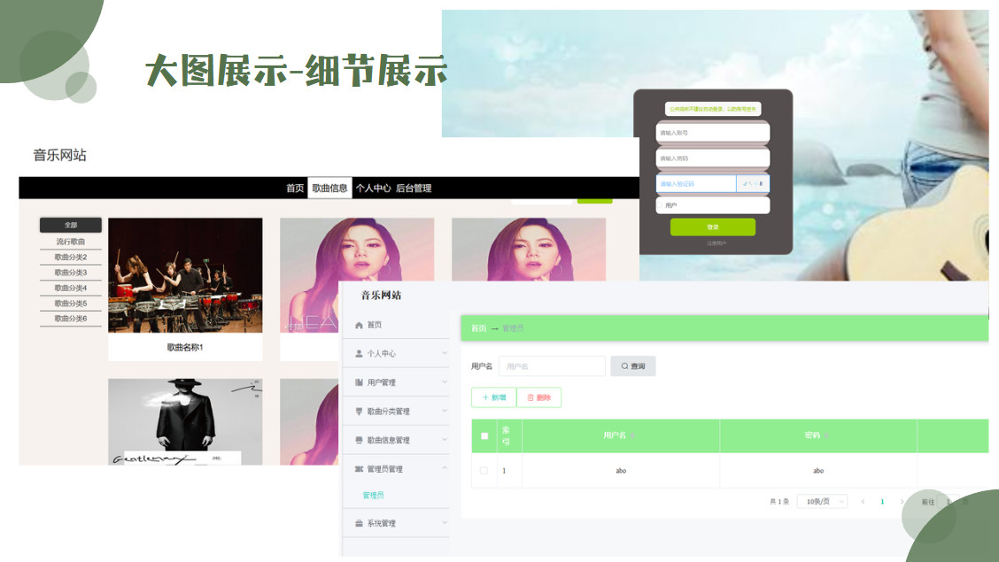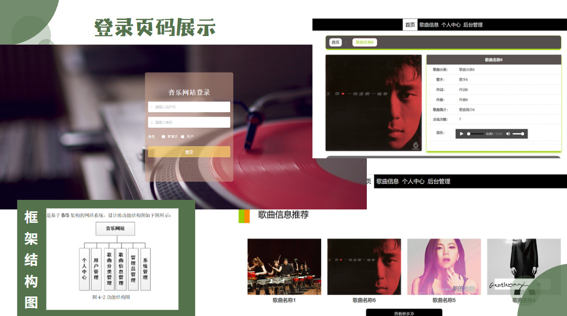 本音乐网站管理员功能有个人中心,用户管理,歌曲分类管理,歌曲信息管理,管理员管理,系统管理等。用户可以注册登录,试听歌曲,可以下载歌曲。因而具有一定的实用性。