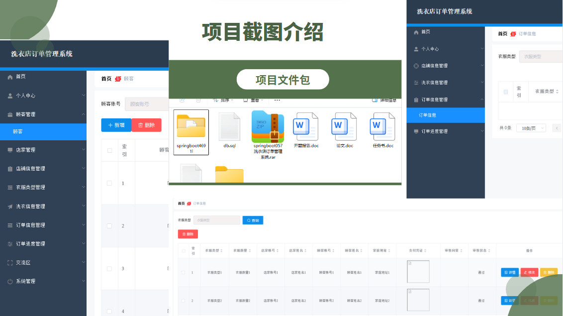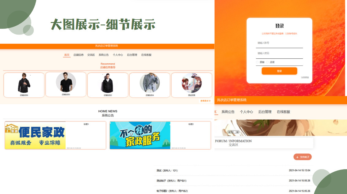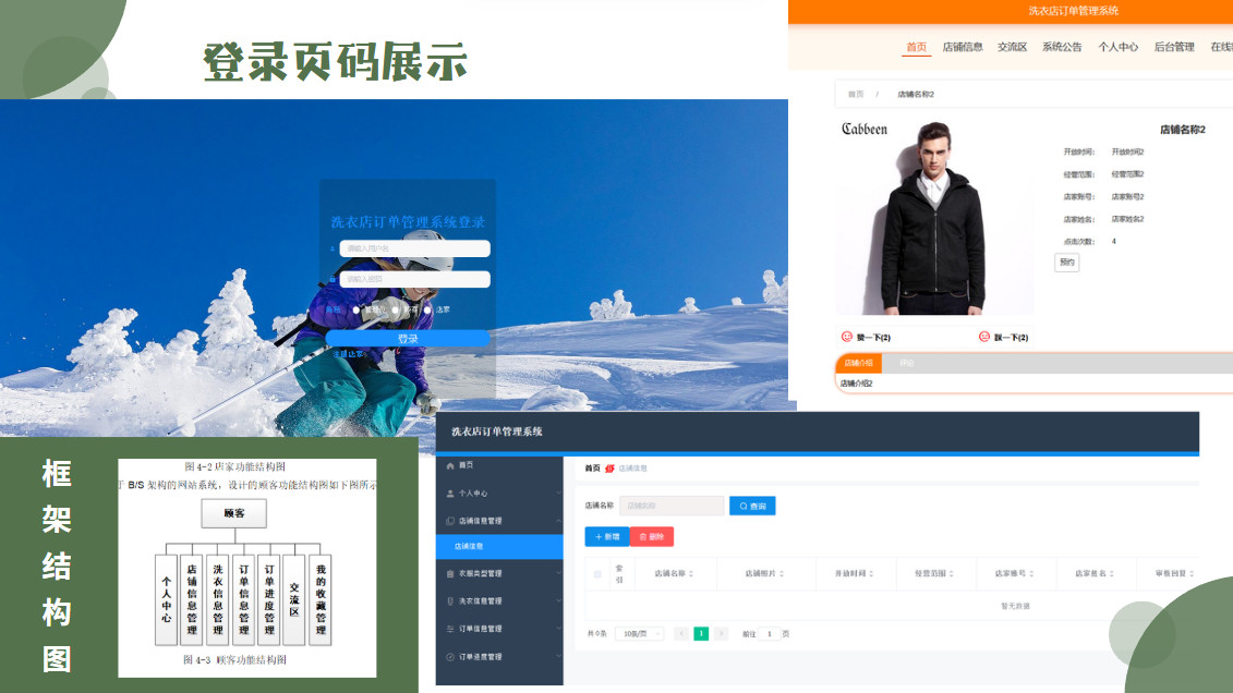 顾客功能有,可以在首页查看店铺信息,交流区发言,个人后台有个人中心,店铺信息管理,洗衣信息管理,订单信息管理,订单进度管理等。因而具有一定的实用性。