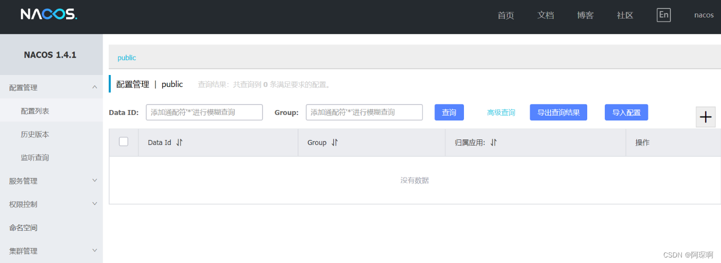 访问:http://虚拟机ip:8848/nacos进行登录验证,默认用户名和密码为nacos/nacos,下为登录后页面