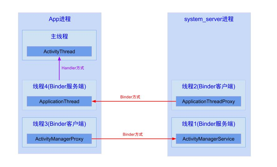 thread.attach(false);便会创建一个Binder线程(具体是指ApplicationThread,Binder的服务端,用于接收系统服务AMS发送来的事件),该Binder线程通过Handler将Message发送给主线程,具体过程可查看 startService流程分析,这里不展开说,简单说Binder用于进程间通信,采用C/S架构。关于binder感兴趣的朋友,可查看我回答的另一个知乎问题: