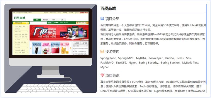 项目介绍:百战商城项目是一个大型综合性的B2C平台。完全采用SOA模式架构,使用Dubbo实现服务调用。基于高并发、海量数据环境进行实现。