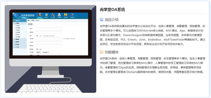 项目介绍:尚学堂OA系统取自真实的尚学堂办公自动化平台,包括人事管理、考勤管理、报销管理、收支管理等多个模块。可以全面练习JSP/Servlet核心技能、MVC模式、Ajax、数据库设计和多表SQL语句操作、PowerDesigner绘制数据库模型图、业务流程图、多种面向对象模型图,还有验证码、POI、Echarts、JUnit、kindeditor、My97DatePicker等辅助技术。通过该项目,学生熟悉项目设计开发流程,具有自主设计和开发项目初步能力。