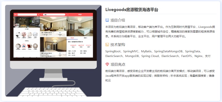 项目介绍:本项目为前后端分离项目,移动客户端为其平台。作为互联网时代房屋平台,Livegoods拥有完善的房屋租赁资源搜索能力,可以根据城市定位,精确高效的搜索到需要的租赁房源信息。本系统分为租客平台、业主平台、用户管理平台两大功能平台。