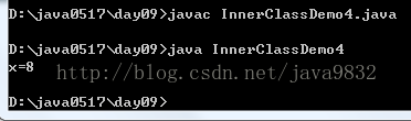 //举的是一个抽象的 abstract class AbsDemo { abstract void show();//抽象方法不应该有主体 } class Outer { int x=8; // 抽象类在每个类中内部进行实现 // class Inner extends AbsDemo // { // public void show() // { // System.out.println("show:"+x); // } public void function() { // new Inner().show(); // new父类 下面是AbsDemo的子类对象,因为只有子类才能覆盖AbsDemo中的抽象方法; new AbsDemo() { // 把AbsDemo类中的抽象方法给实现了 public void show() { System.out.println("x="+x); } }.show();//调用show方法。 } } class InnerClassDemo4 { public static void main(String[] args) { new Outer().function(); } }7、运行后的结果